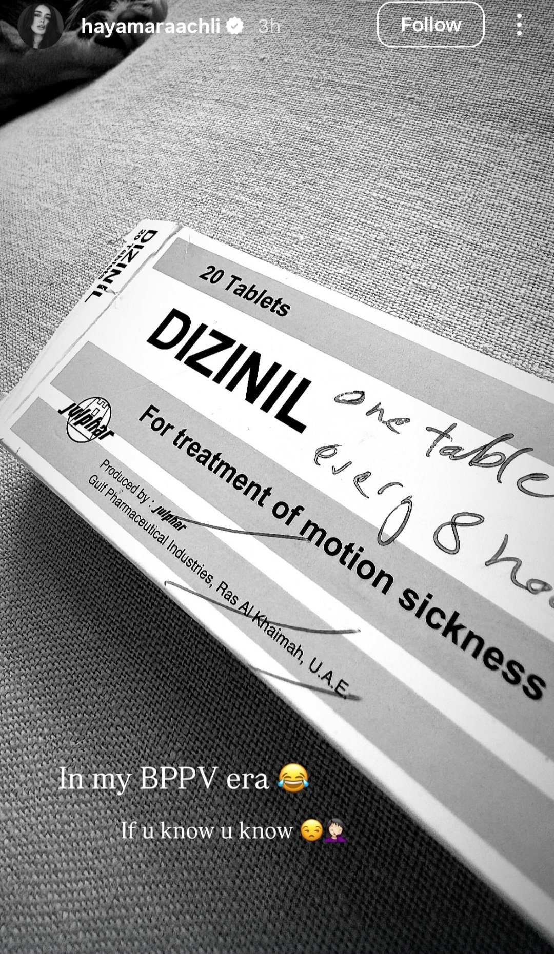 وأظهرت هيا مرعشلي قدرتها على التعامل مع مرضها بروح مرحة، حيث نشرت صورة لعلبة الدواء المصاحبة لعلاجها، وأرفقتها بتعليق طريف قالت فيه: "في فترة معاناتي مع الدوار، إذا كنتم تعلمون بذلك"، مع مجموعة من الإيموجي التي تعكس المزاج بين