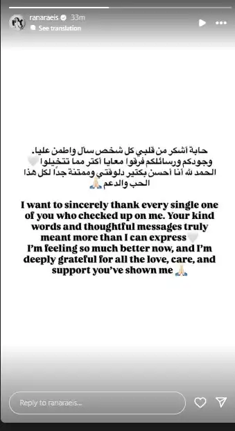 وعبرت رنا رئيس في الستوري قائلة: "بشكر كل شخص سأل واطمن عليا، وجودكم ورسائلكم فرقوا معايا أكتر مما تتخيلوا. الحمد لله أنا أحسن بكتير دلوقتي وممتنة لكل الحب."