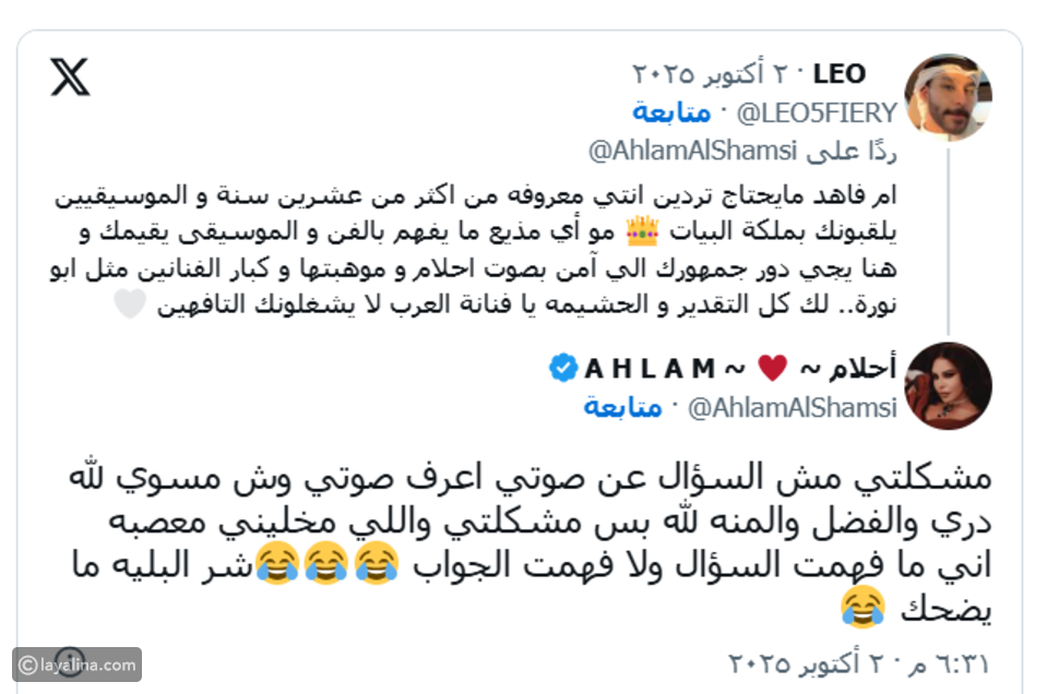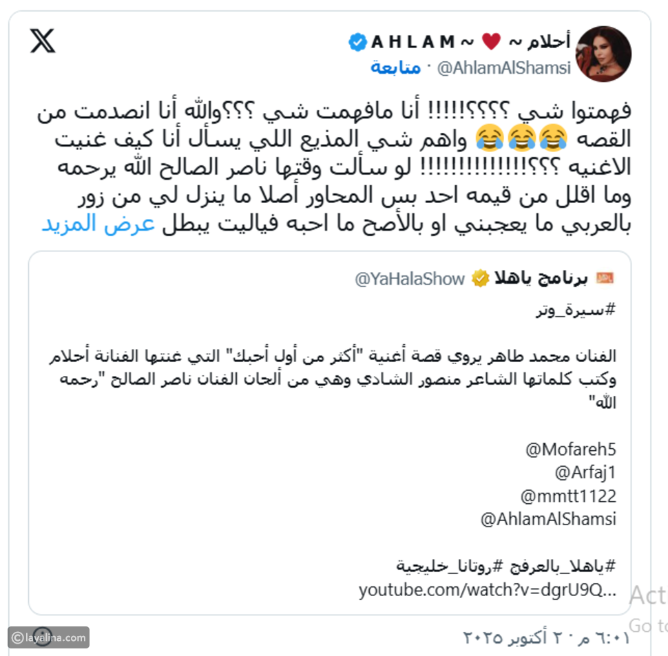وعبرت أحلام عبر إعادة نشر تغريدة البرنامج عن استيائها وكتبت: "فهمتوا شي؟ أنا ما فهمت شي! والله أنا انصدمت من القصة". وأضافت: "وأهم شي المذيع اللي يسأل: أنا كيف غنيت الأغنية؟! لو سألت وقتها ناصر الصالح الله يرحمه… شي مستفز! أنا قايلة ببطل أرد على أي حد عشان يصير مشهور، بس ليش لا؟ مو غلط،