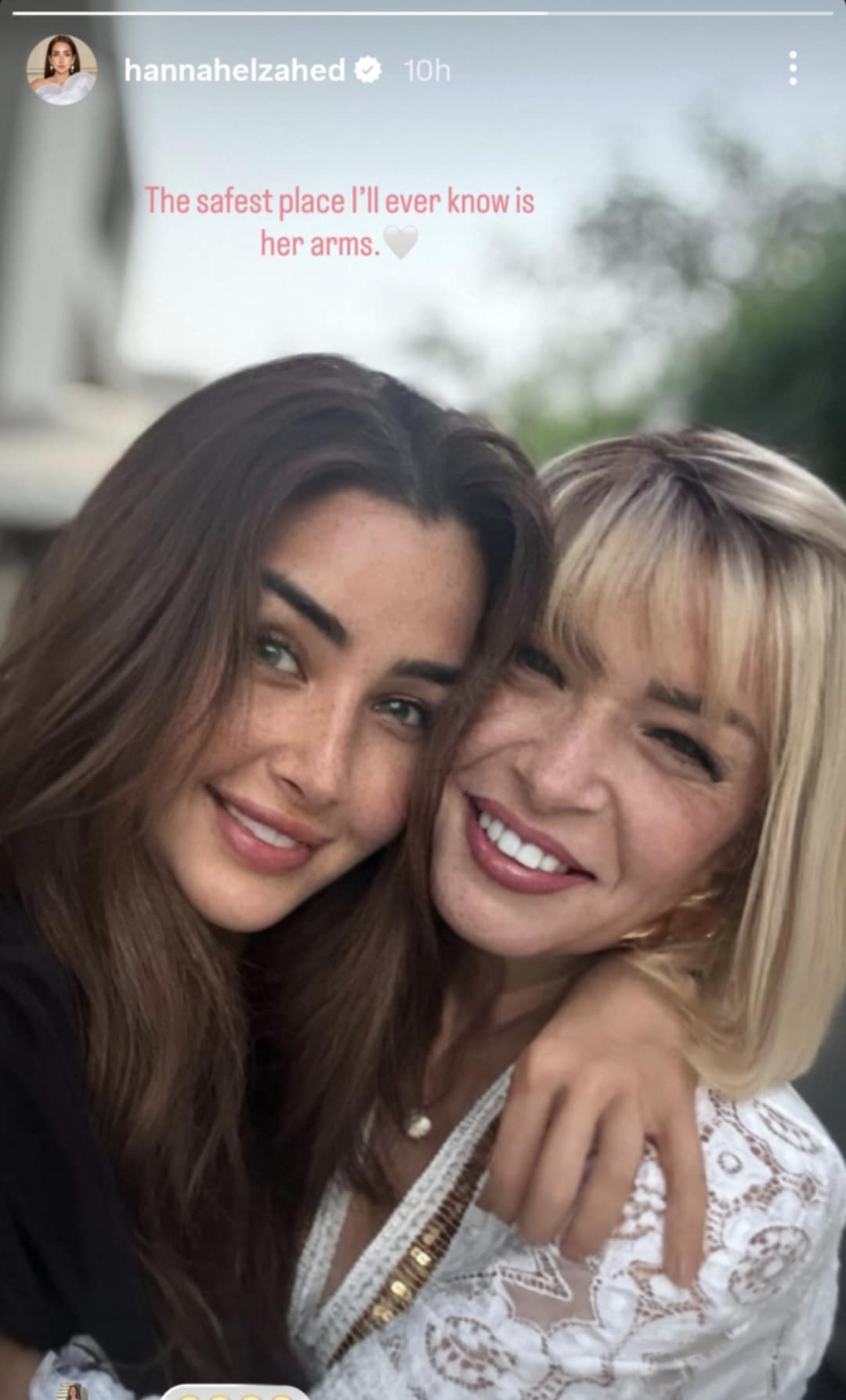 نشرت الفنانة المصرية هنا الزاهد صورة تجمعها بوالدتها شيرين المنزلاوي، وهي تحتضنها بحرارة، وعلّقت قائلة: "أأمن مكان أنا عرفته بين ذراعيها"، في إشارة إلى عمق العلاقة والمحبة التي تربطهما. وتفاعل الجمهور مع الصورة متمنين لهما حياة مليئة بالسعادة والاستقرار وسط عائلتهما.