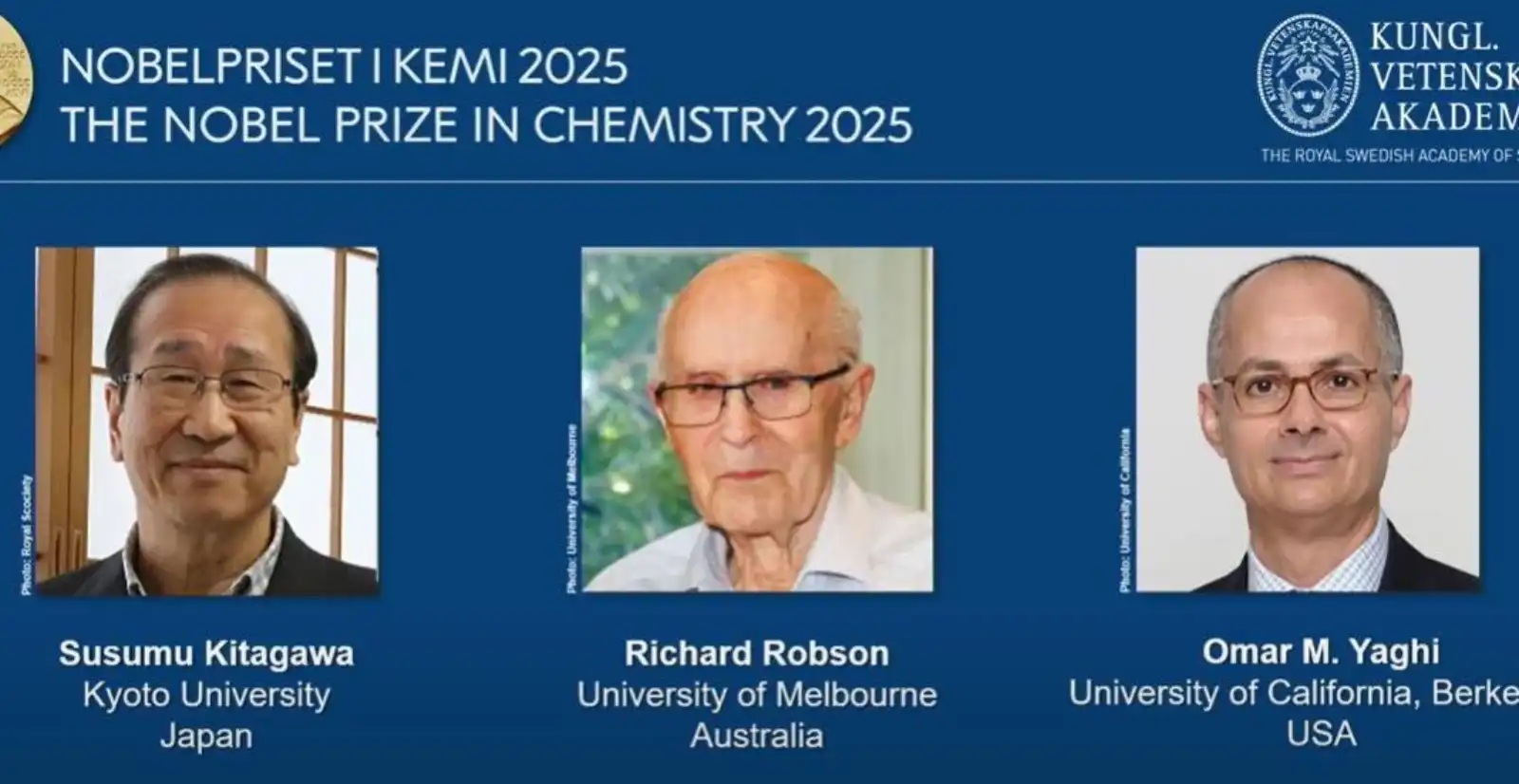 وأعلنت لجنة نوبل أن الجائزة منحت لياغي وكيتاغاوا وروبسون تقديرًا لتطويرهم الأطر المعدنية العضوية التي غيّرت وجه الكيمياء الحديثة، وسيتقاسم الفائزون مبلغ 11 مليون كرونة سويدية (نحو 1.2 مليون دولار) في حفل سيُقام في ستوكهولم.