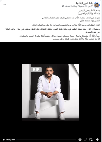 ونعت بلدة العين البقاعية ابنها على صفحة رسمية عبر موقع التواصل الاجتماعي " فيسبوك"، وكتبت: "ببالغ الحزن والأسى، وبقلوب مؤمنة بقضاء الله وقدره، تنعى بلدة العين فقيدها الشاب الغالي بهاء محمد خليل. غادرنا بهاء تاركاً خلفه سيرة طيبة