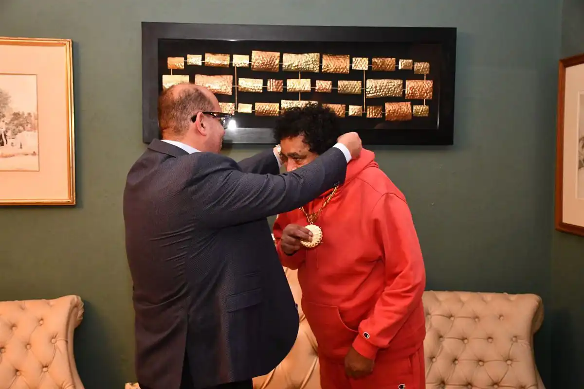 وقلد المهندس ياسر إدريس خلال احتفالية أقيمت في مقر اللجنة محمد منير قلادة العظماء الأولمبية بحضور المهندس أدهم دهب عضو اللجنة الاقتصادية، والكاتب الصحفي ياسر عبد العزيز، رئيس المنظومة الإعلامية للجنة.