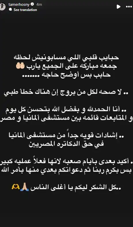 وأضاف الفنان أن هناك متابعة طبية مستمرة بين المستشفى الألماني والأطباء في مصر للاطمئنان على صحته، مشيرا إلى صعوبة العملية التي أجراها وحاجتها إلى فترة نقاهة طويلة، قائلا: "العملية كانت صعبة وكبيرة، شكرا للجميع".